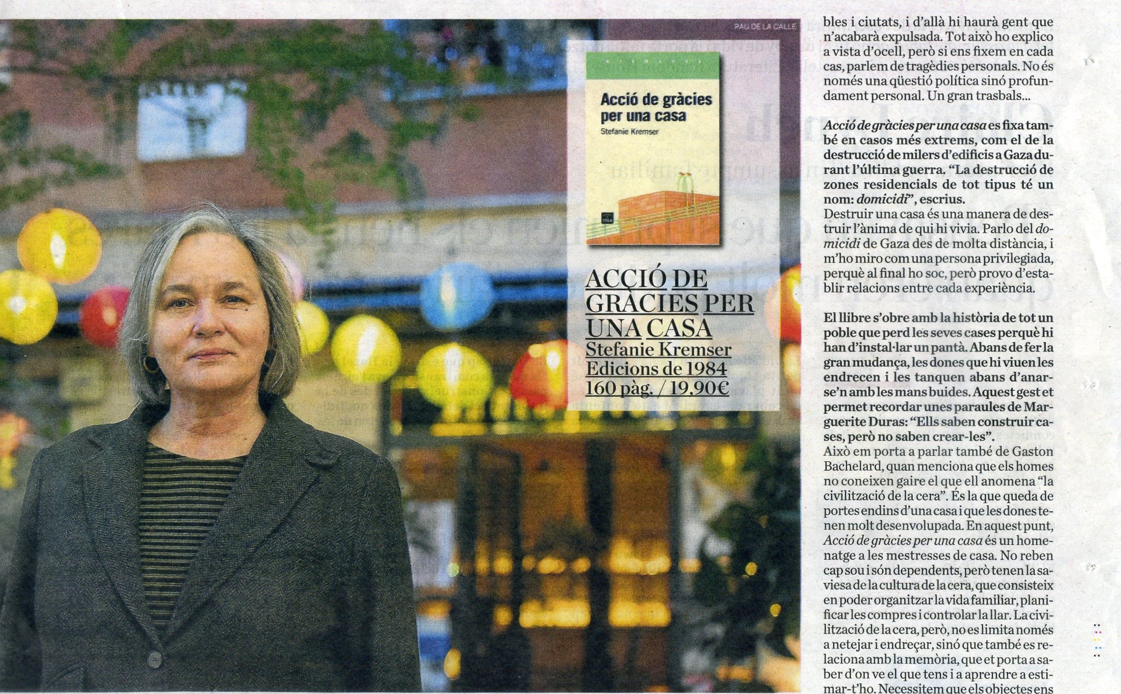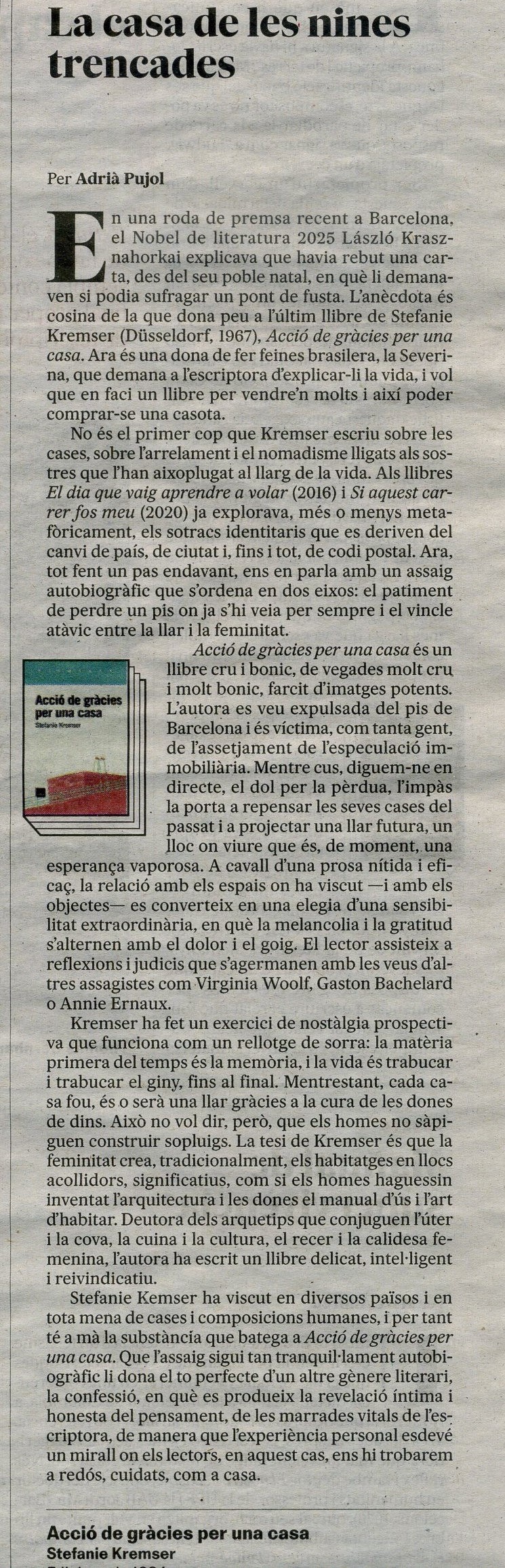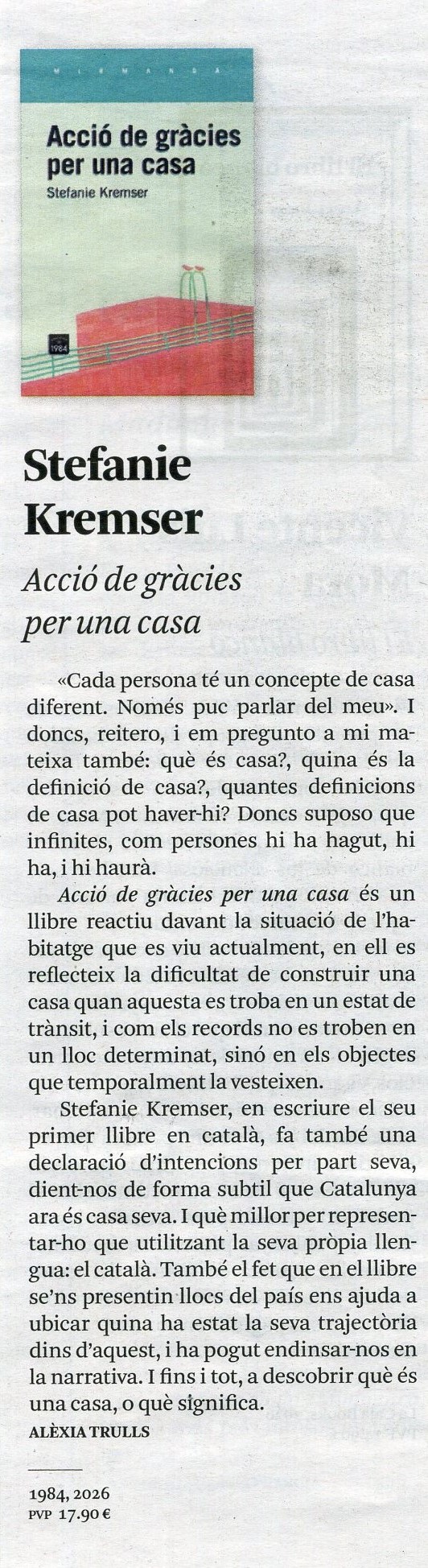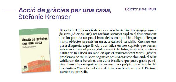 Mentre ella mateixa busca una casa, Stefanie Kremser ens convida a entrar a les llars de la seva vida —del passat, del present, del futur— i de les vides d’altres persones. Amb cada porta i finestra que obre, sentim la remor d’unes dones que endrecen objectes, gestos, idees, sentiments. Perquè una casa és molt més que les seves quatre parets, i pot ser tan diversa i personal com els seus habitants al llarg del temps. A mig camí de la memòria i l’assaig, són moltes les veus que escoltem a Acció de gràcies per una casa: veus reals i de ficció, veus d’altres escriptores, pensadores i artistes. Veus que ens transmeten històries, vivències, desitjos, i que totes juntes afinen el sentit d’aquest llibre: tenir un lloc on puguis dir «això és casa meva».