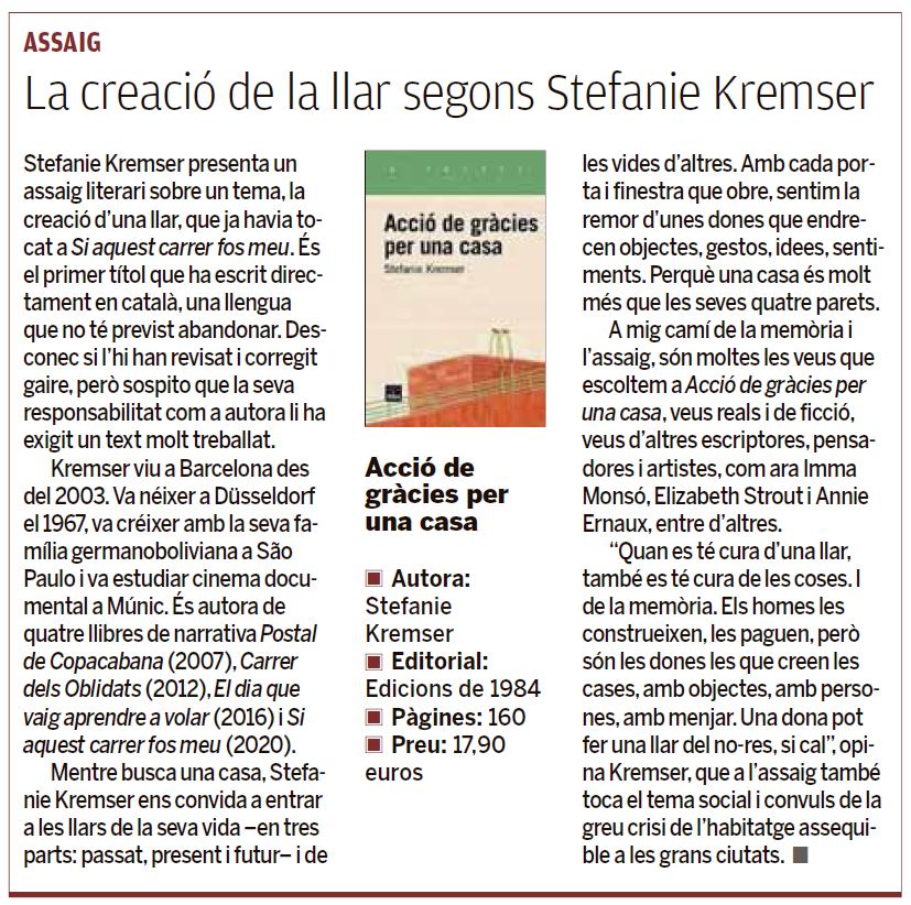 Stefanie Kremser viu a Barcelona des del 2003. Va néixer a Düsseldorf el 1967, va créixer amb la seva família germanoboliviana a São Paulo i va estudiar cinema documental a Múnic. És autora de quatre llibres de narrativa, tots traduïts al català: Postal de Copacabana (Club Editor, 2007), Carrer dels Oblidats (Empúries, 2012) i, publicats a Edicions de 1984, El dia que vaig aprendre a volar (2016) i Si aquest carrer fos meu (2020). Acció de gràcies per una casa és el seu primer llibre escrit en català.
