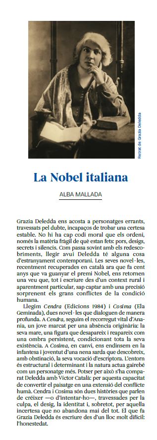 Grazia Deledda (Nuoro, Sardenya, 1871 – Roma, 1936) és considerada una de les veus literàries més importants d’Itàlia. Amb una obra marcada per la vida i les tradicions de la seva illa natal, va explorar temes com la fatalitat, la culpa, la religió i les relacions humanes amb un estil intensament líric i simbòlic. La seva trajectòria va ser reconeguda amb el Premi Nobel de Literatura l’any 1926, fet que la va convertir en la primera —i de moment única— escriptora italiana a rebre aquest guardó.