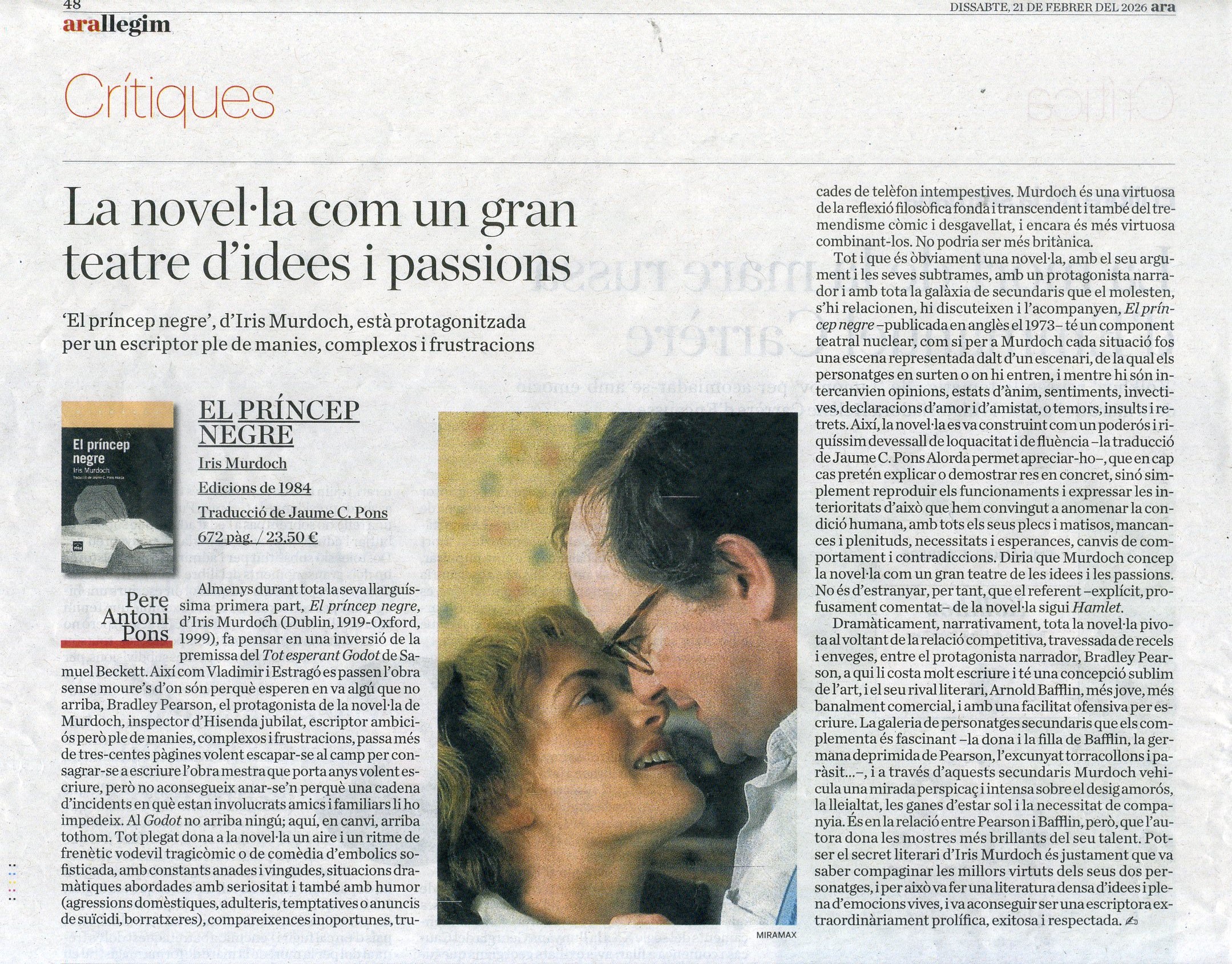 Entre girs inesperats i amb un suspens psicològic creixent, Iris Murdoch construeix una tragèdia poc convencional, en què el destí irromp amb la mateixa força implacable que en el teatre de Shakespeare. El príncep negre és una novel·la sobre l’art, l’egoisme i la naturalesa ambigua de l’amor, però també una reflexió irònica i punyent sobre l’acte d’escriure i les ficcions que ens construïm per suportar la realitat.