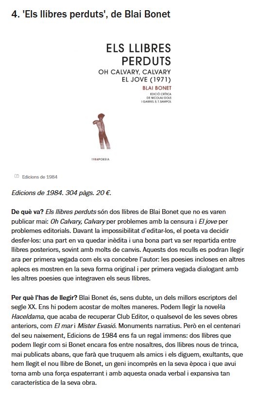 Els llibres perduts són dos llibres de Blai Bonet que no es varen publicar mai: Oh Calvary, Calvary per problemes amb la censura i El Jove per problemes editorials. Davant la impossibilitat d’editar-los, el poeta va decidir desfer-los: una part en va quedar inèdita i una bona part va ser repartida entre llibres posteriors, sovint amb molts de canvis. Oh Calvary, Calvary va guanyar el Premi Carles Riba 1962 i, malgrat que s’hagi dit sovint, no és una primera versió de L’Evangeli segons un de tants; només comparteixen cinc poesies. D’altra banda, El Jove de 1971 és un llibre completament diferent d’El Jove publicat el 1987. Sense malentesos, doncs, el lector trobarà en aquest volum dos llibres a descobrir.