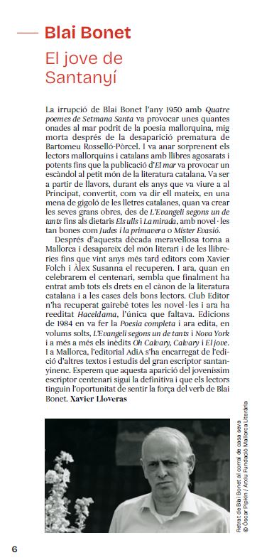 Blai Bonet (Santanyí, 1926 – Cala Figuera, 1997), poeta, novel·lista i crític d’art. Fill de família humil, va ingressar al seminari, però va haver d’interrompre els estudis eclesiàstics a causa de la tuberculosi. La seva obra poètica inclou obres com ara El Color, L’Evangeli segons un de tants, El poder i la verdor i Nova York. Aquest volum que el lector té a les mans recull els dotze llibres publicats pel poeta al llarg de cinquanta anys i els dos reculls que va deixar inèdits (Sonets i el cicle d’Albons…); també s’hi troben les poesies que són variants prou diferenciades de les que apareixen en aquests reculls, i igualment s’hi inclouen totes les publicades esparses o inèdites a les quals s’ha pogut accedir, incloses les que formaven part dels llibres Oh Calvary, Calvary i El Jove (1971), dos aplecs que el poeta va deixar sense publicar i que, en part, va reaprofitar en reculls posteriors.