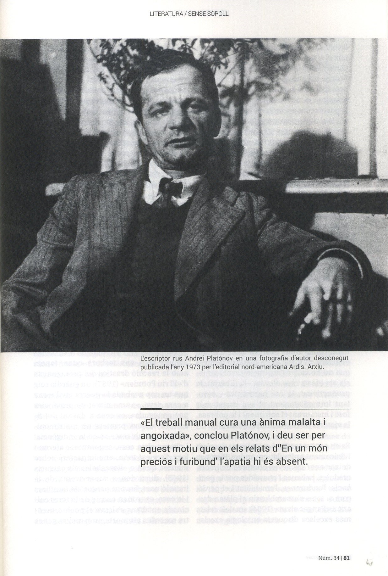Andrei Platónov (Vorónej, 1899 – Moscou, 1951) creu en el socialisme i intenta penetrar en l’ànima del seu poble per trobar-hi les respostes al deteriorament i a la confusió que ja s’hi palpen. El preu que paga per això és l’aïllament i una mort prematura. La repressió i la pobresa el van acompanyar fins al final de la seva vida. Fins l’any 1980 la seva obra no es va conèixer a Rússia. Platónov, el grandíssim escriptor rus, de qui Hemingway deia que era el mestre de la prosa, ha estat comparat amb Joyce, Proust, Kafka o Mann.