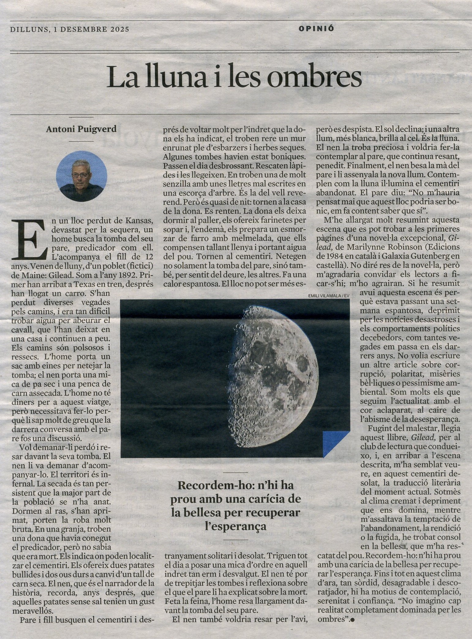 De les desfetes de l’ànima a les seves victòries incertes, de l’exaltació de la carn o dels errors del cor als vertígens del misticisme, amb una prosa tan emotiva que es fa inoblidable, Marilynne Robinson, a través de les paraules del reverend Ames, dedica a l’estranya i meravellosa gràcia de viure un himne immens, ample com el país que narra, exigent com tota conquesta espiritual i tan trasbalsador com una pregària.