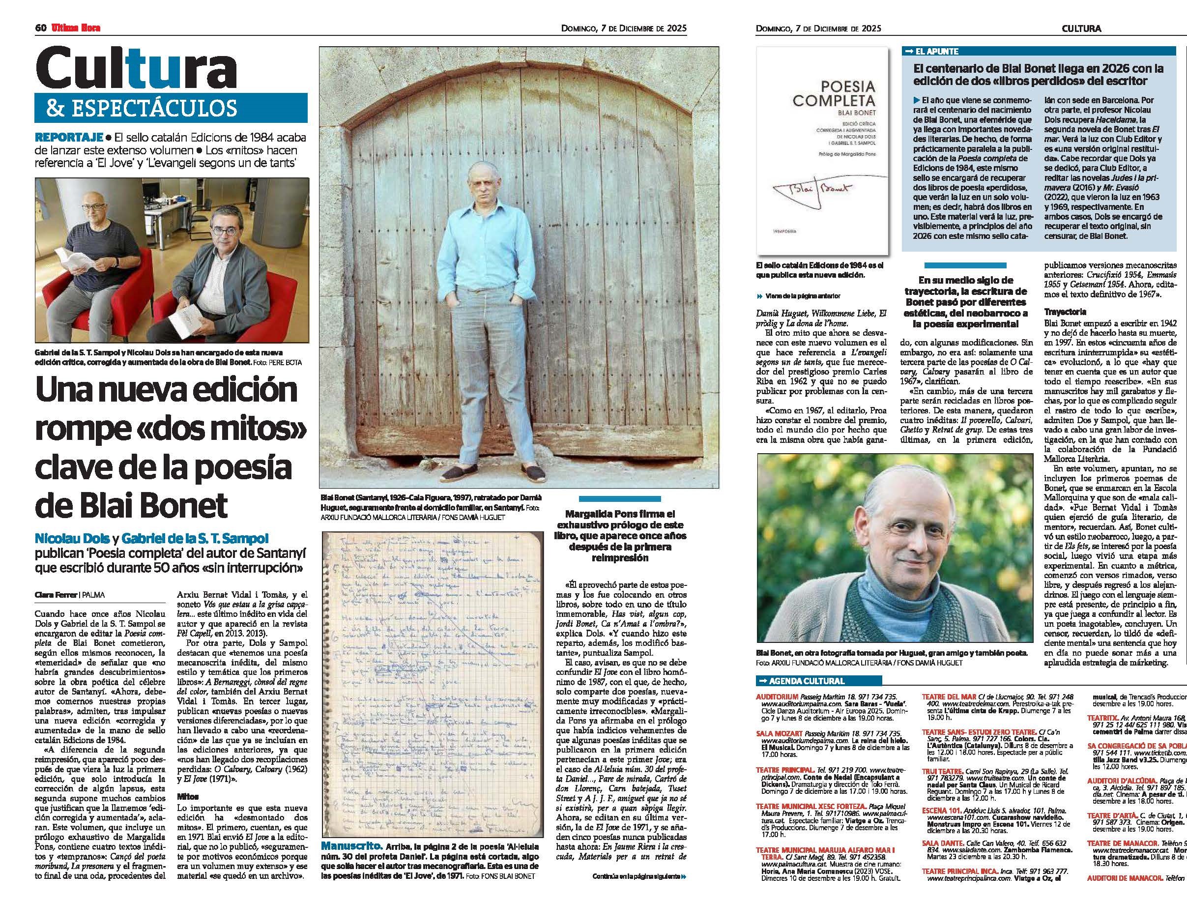 Blai Bonet (Santanyí, 1926 – Cala Figuera, 1997), poeta, novel·lista i crític d’art. Fill de família humil, va ingressar al seminari, però va haver d’interrompre els estudis eclesiàstics a causa de la tuberculosi. La seva obra poètica inclou obres com ara El Color, L’Evangeli segons un de tants, El poder i la verdor i Nova York. Aquest volum que el lector té a les mans recull els dotze llibres publicats pel poeta al llarg de cinquanta anys i els dos reculls que va deixar inèdits (Sonets i el cicle d’Albons…); també s’hi troben les poesies que són variants prou diferenciades de les que apareixen en aquests reculls, i igualment s’hi inclouen totes les publicades esparses o inèdites a les quals s’ha pogut accedir, incloses les que formaven part dels llibres Oh Calvary, Calvary i El Jove (1971), dos aplecs que el poeta va deixar sense publicar i que, en part, va reaprofitar en reculls posteriors.