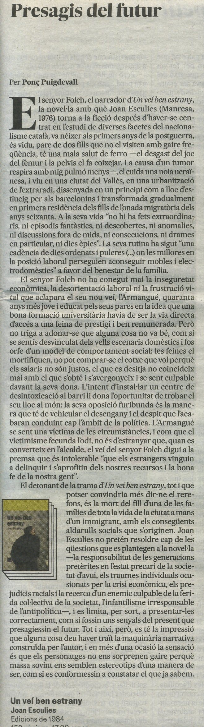 Amb ressons del realisme americà, Joan Esculies ens ofereix un retrat actual i urbà d’una societat canviant, fragmentada i saturada emocionalment. En la seva novel·la la ficció no és un artifici, es posa al servei de la realitat per construir l’imaginari que ens permet reconèixer-nos en un temps que sembla escolar-se sense control.